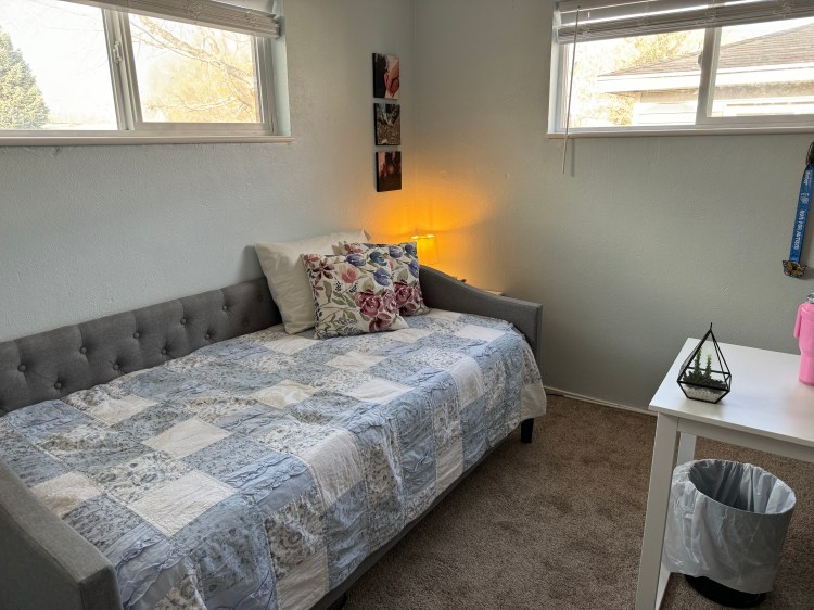 The room is a pretty standard sized bedroom from the 1950s, two windows, and a small closet. Kenzee needed her desk to stay where it was located so she could see into the living room, where her children are in the afternoon while she is working. The couch needed to remain or a bed needed to take it’s place, so the room could continue to function as a guest room.