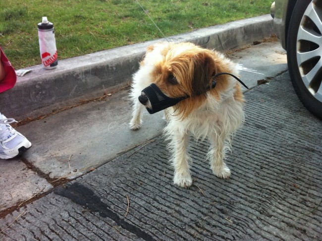 This weekend Nicole urged me to bring Bella and I was only willing to allow her if she was wearing her muzzle and pinch collar. I was laughing at how scary this makes our 14 pound dog look when Nicole came up with Bella’s running nickname: Hanibella Lecter.