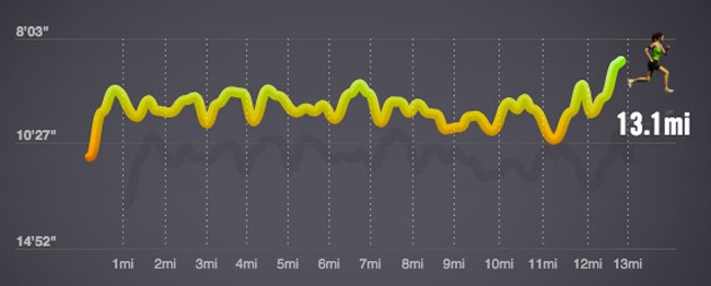 Between mile 9 and 10 my brain decided that my knee was going to break. I had a little conversation with myself that I was fine and to stop whining and get my butt to the end. For some reason, at that very moment, I looked up and saw Chad running up the overpass above me. I shouted at him four times before he finally looked down and waived.