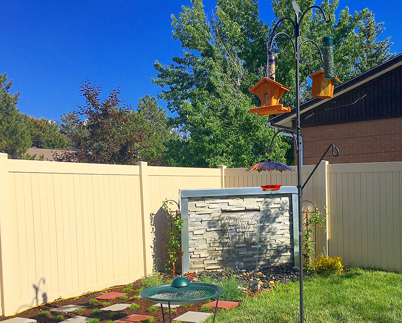 First it was attached to the bird diner, but we read that the hummingbirds might be a little too anxious to eat with all those other bigger birds swooping in and out. Then we moved the feeder by the water feature, but I think that was still too close to the bird diner that was getting more and more popular by the day. Finally, we bought some butterfly bushes and move the hummingbird feeder to it’s final home.