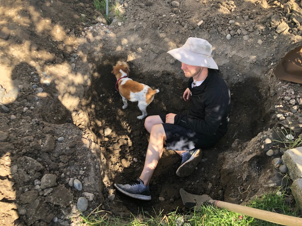 First, there needed to be a MUCH larger hole. We learned, from several hours of youtube research, that for the size of water feature we were building that we needed to hold a little more water than what we had done previously. Which explained why after a couple of hours running our old water wall, it would run out of water. This was probably the part of the project that took the longest: Chad digging out the hole and sloping it.