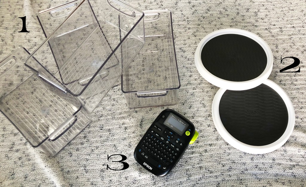 After everything was sorted (and expired medications were tossed) I decided I needed four clear bins and two 9-inch lazy susans. I had the bins (1 – iDesign Plastic Storage) in the garage left over from another project so they just had to be cleaned. I ordered the lazy susans (2 – Copco 9-inch Lazy Susan Turntable) which conveniently came in a pack of two. And of course, my trusty (3) label maker.
