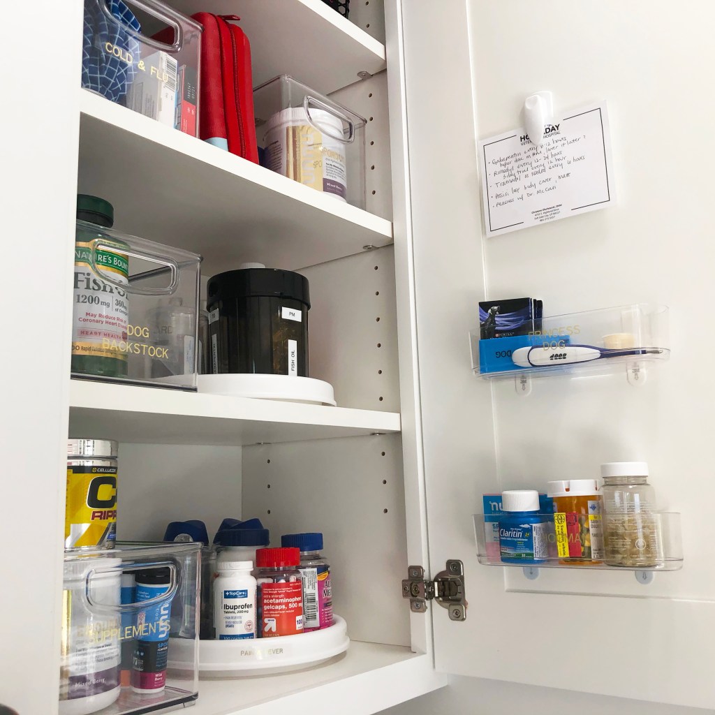After Bella’s vet appointments, there is usually a new plan for her medications and therapy. I decided to add a command clip to post her most recent doctor note for all to see and reference. She has her own caddy for her (personal and labeled) thermometer and (personal and labeled) pill cutter. She also has her own lazy susan for her medications and a bin for her backstock.