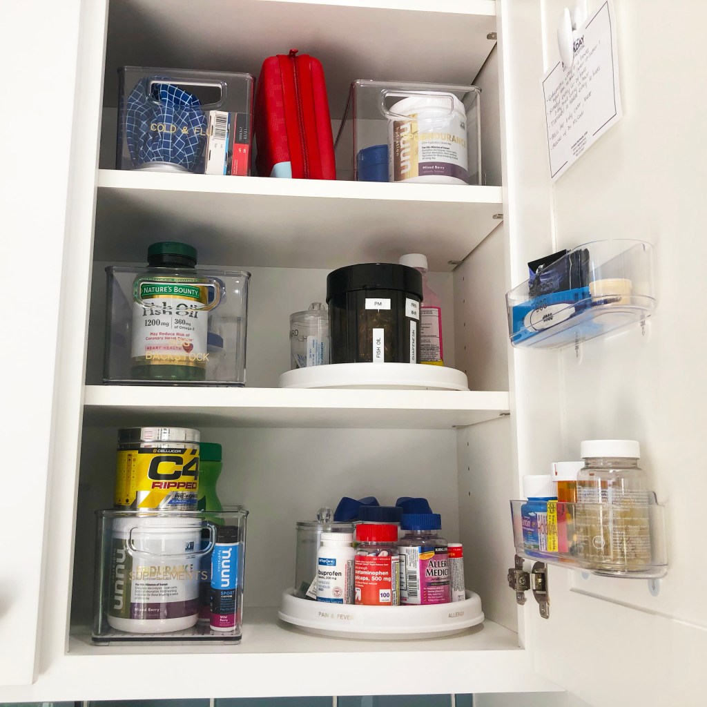 Our meds all fit on the lower lazy susan and lower caddy. All the supplements fit into one clear bin. I used the top two bins for cold & flu medicines and backstock, with space in between for the first aid kit.