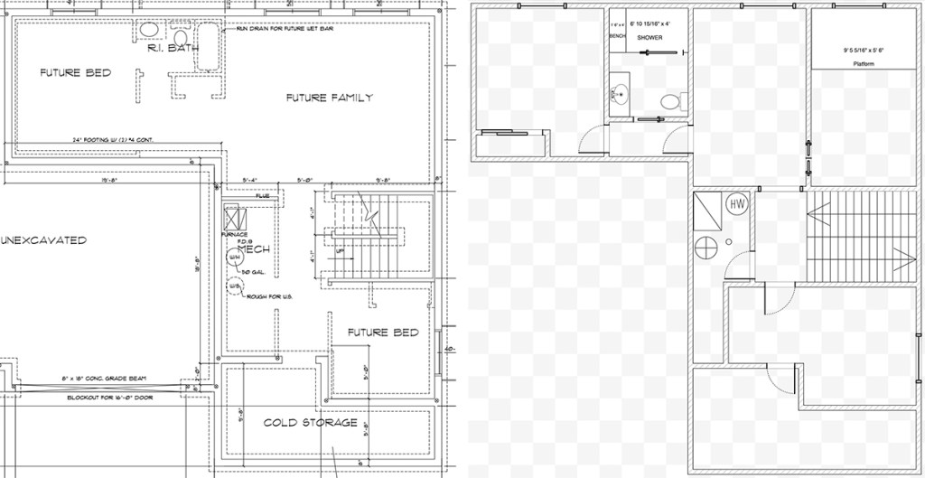 The first thing we needed to do was have the bathroom rough-ins redone. For reference the (incorrect) bathroom rough-ins are sticking up out of the concrete behind the shop-vac in the above photo. The bathroom that was set in concrete was weird, unnecessarily cramped, and tiny. Since this will mainly be used by my favorite sister and my favorite future brother-in-law who is part sasquatch, that bathroom needed to be at minimum, normal sized.