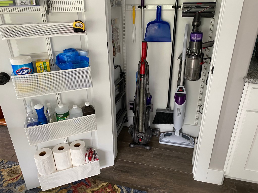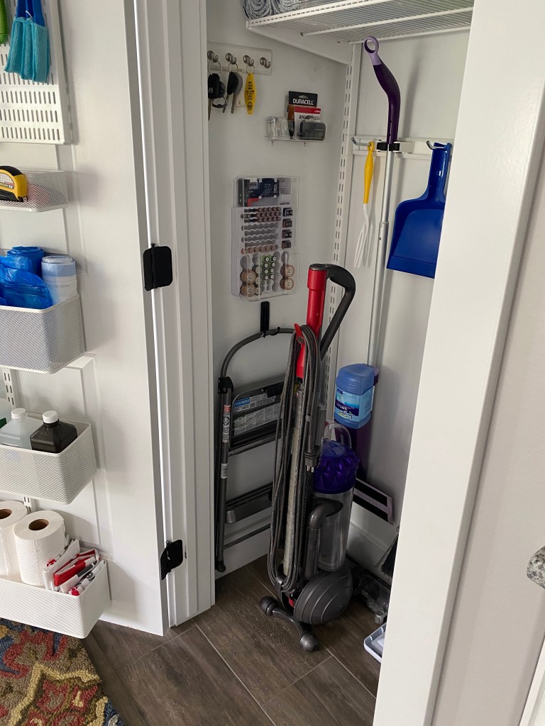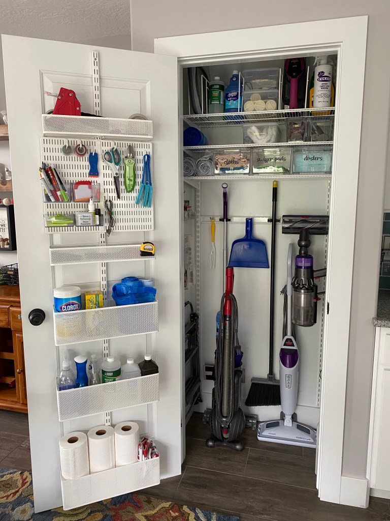 I added an Elfa Door and Wall Rack which makes the closet work that much harder. We have a few things that were frequently left on the kitchen counter (packing tape, sharpies, measuring tape, box cutters) and after a year or two, we made room for them in the Broom Closet.