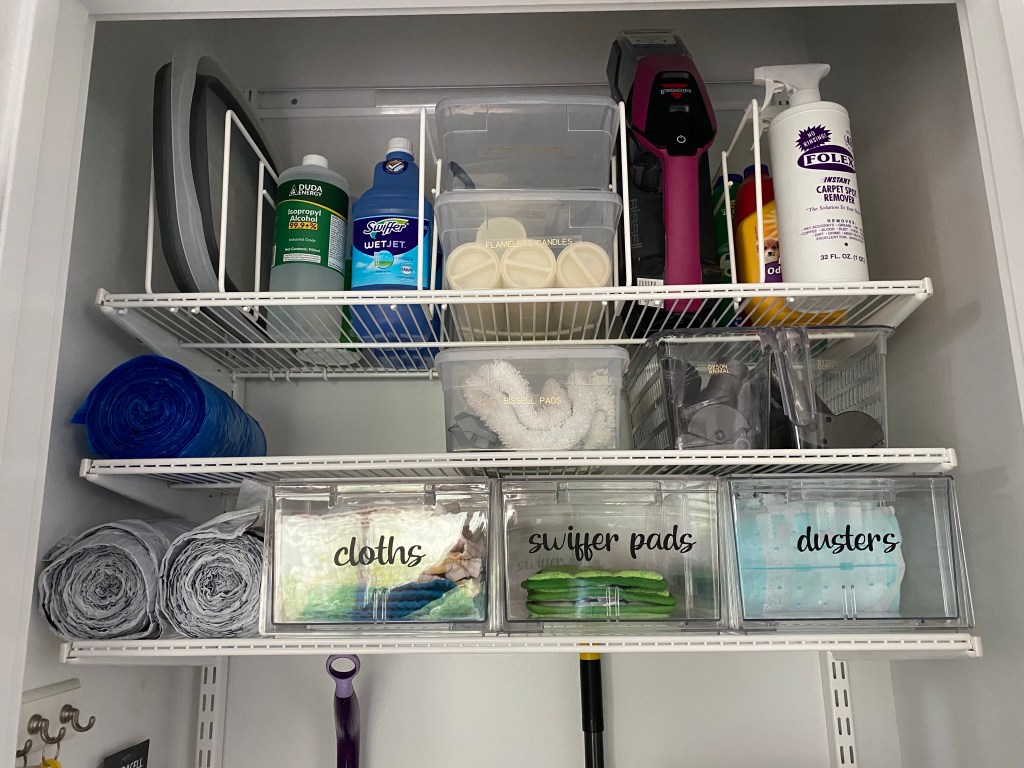 I hate keeping things in boxes, mostly due to how difficult it is to uniformly store things in them. So the swiffer pads (we are transitioning to the kind that can be washed), reusable wash cloths, and dusters are kept in clear stackable large shoe drawers.