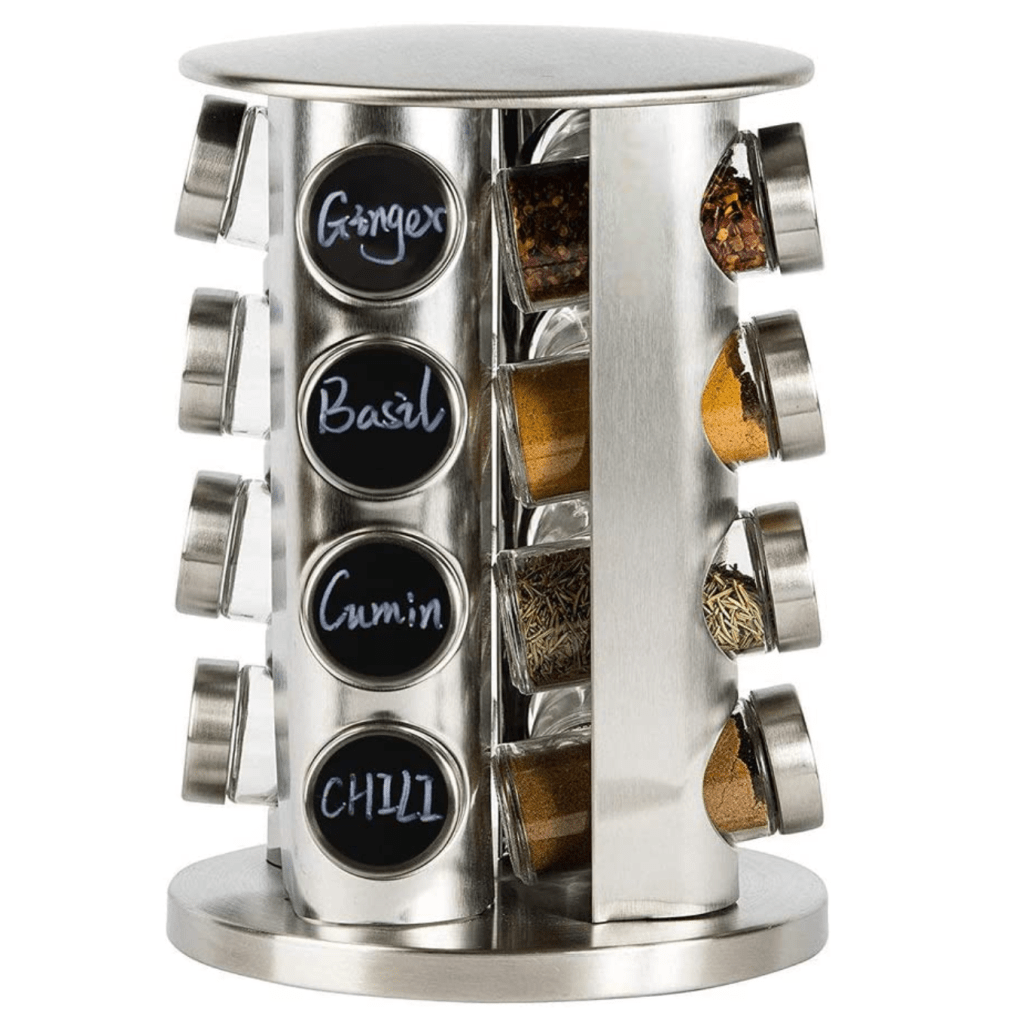 A wall mount spice rack (Amazon, jars not included) is great to free up cabinet space, if you have the wall space in your kitchen (or pantry) to spare. Since the jars aren’t included AND each section is separate, you can use your spices in the containers they come in and adjust the heights accordingly. A counter top spice rack or spinner (Amazon and Amazon, jars and labels included) is great if you have the counter space to spare and don’t want to purchase spice jars separately.