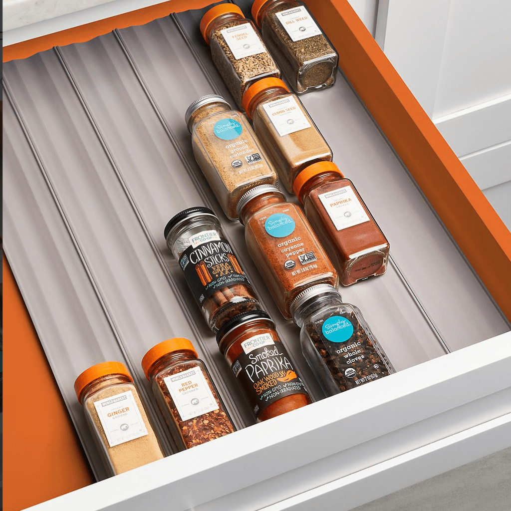 Whenever we are talking about drawer organizers (and if you hang out with me, that’s bound to happen) I will rant about the sizes of drawer organizers offered and how often there’s just enough space left over in a drawer to drive me insane. Which is why I love expandable drawer organizers like these (Amazon and Amazon). The spice liner roll (Amazon) is a good second place because you can cut to fit the length of your drawer, but there’s nothing to be done about the width if it isn’t exact. All the above options also allow you to use the spice containers you already own.