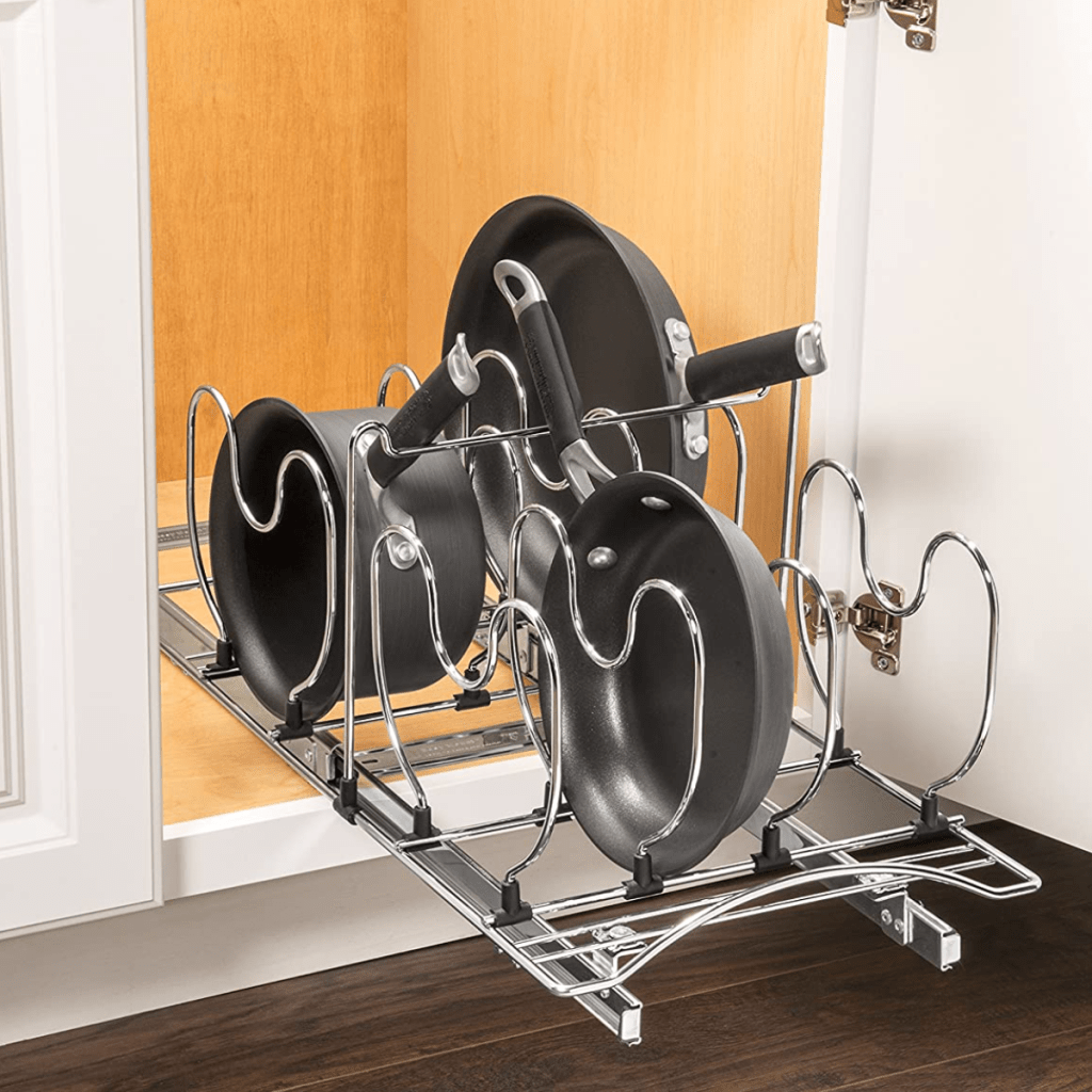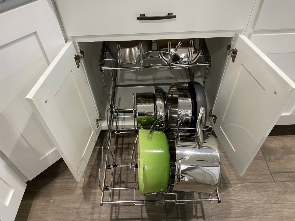 This Rev-A-Shelf solution was perfect for our kitchen. The whole unit fit in the cabinet right near the stove, and was able to fit our most frequent used pots and pans and their lids, with room to spare. It was pretty simple to install, too.