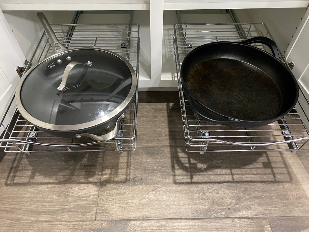 Pots, Pans, cookware, and bakeware are generally the most difficult thing to organize in a kitchen. They are bulky, different sizes, and don’t often stack easily – and sometimes shouldn’t be stacked at all (teflon). No matter how nicely you stack and store them, you’ll often find yourself needing an item nestled in the middle, undoing the whole stack. And that’s not even taking into consideration the lids!