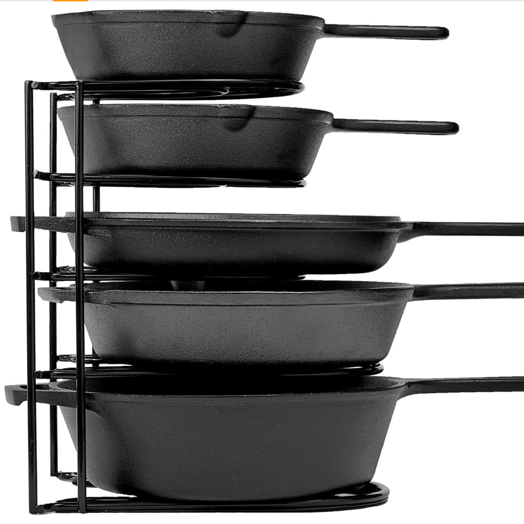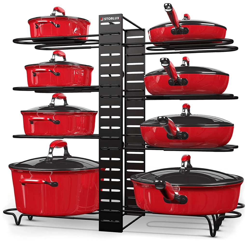 I love these storage options because they are inexpensive, but still offer the ability to stack your cookware, without scratching, and without needing to worry about knocking everything over when you remove a piece. The STORLUX, the 7-Compartment Chrome Holder, and the Heavy Duty Pan Organizer, can all be stacked horizontally or vertically, which gives you greater flexibility for storage options.