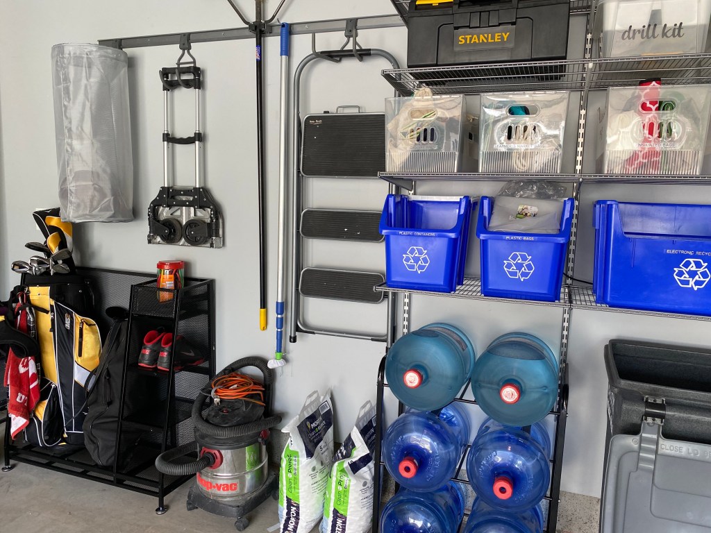 The piles that were threatening to take over were as follows: a pile of water bottles (empty and full), water softener pellet bags, a mix of recycling that our city no longer accepts, tool kits, and sporting goods. I took stock of the available wall space that wasn’t being utilized and got to work creating new zones for everything.