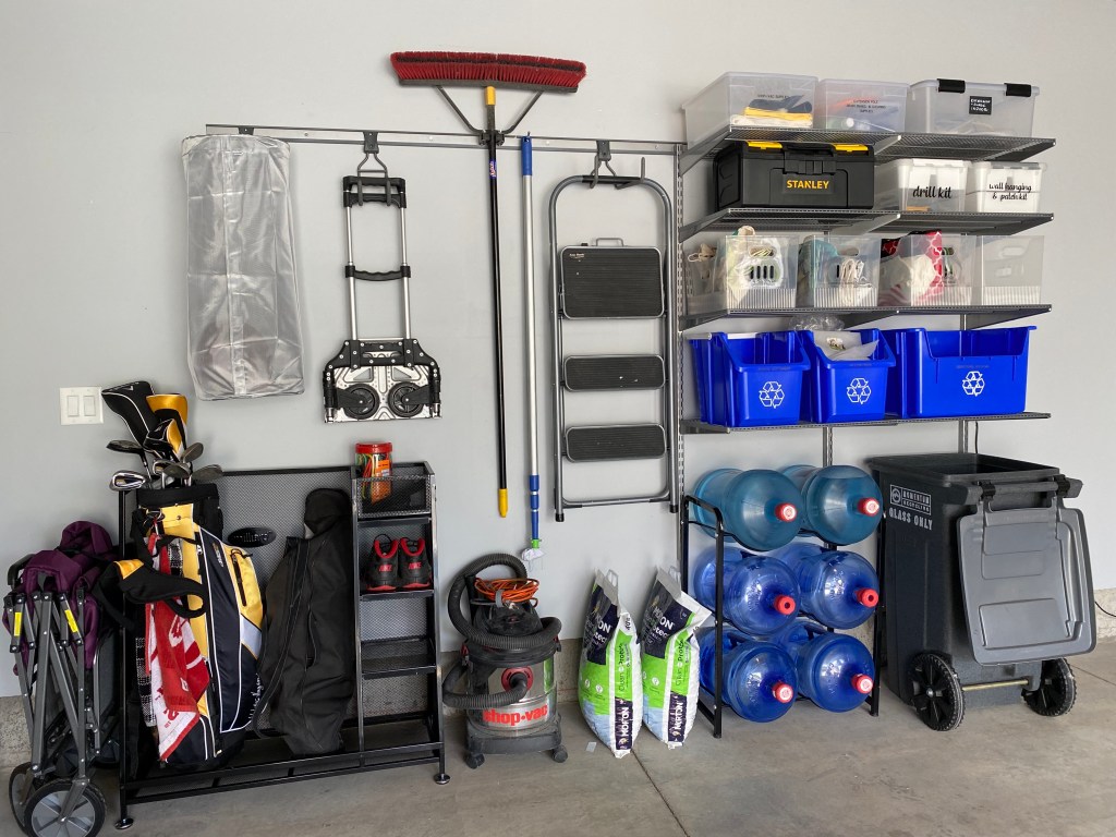 Everything else that was already being stored still has space – which were heavy duty cleaning supplies, the handcart, shop vac, push broom, and the multi-use extension pole. And I have a little room left over for any changes in the future. So until the next nomadic clutter piles start to form, this is the organized garage wall.