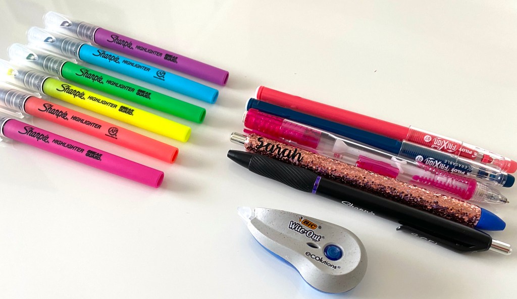 I whittled down my pen collection to erase-able pens (for iffy plans), my purple and blue sharpie S-gels, and then a set of highlighters to color code items as crossed off. Since I don’t actually like “crossing” something off unless it was cancelled or incomplete and moved to a new list. I also have a little white out tape dispenser because even the most seemingly permanent of plans get cancelled and changed. Or mispelled.