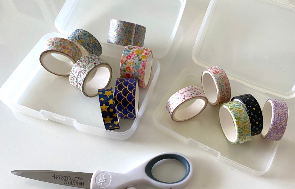 I finally found something to do with my already large washi tape collection. But of course I needed more because I found that I liked the gold foiled kinds. Several of the ones I currently am using aren’t available on Amazon right now but I’m sure they’ll come back eventually. The clear hinged boxes are from The Container Store. I added a set of small craft scissors so that I can always cut some tape on the go. It sounds like an innuendo, but I assure you it is not. Yet.