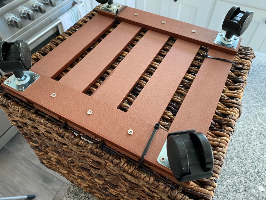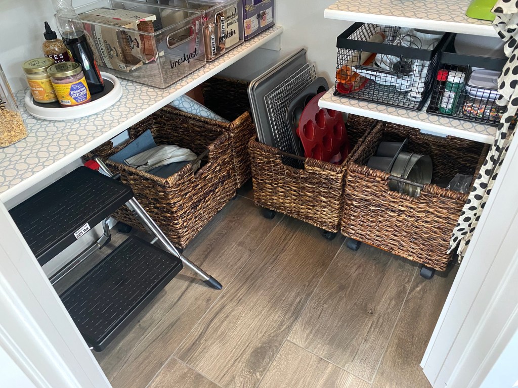 The baskets are wicker crates from Target, and I zip tied the baskets to a plant caddy so I could move them around in the pantry more easily. In the basket that holds the cookie sheets, I added a small 4-sort divider from The Container Store – because if I’m going to store a bunch of things in a basket, I prefer that when removing an item or two, the entire stack doesn’t fall over – so these neat things prevent that from happening. I also zip tied the 4-sort divider in place.