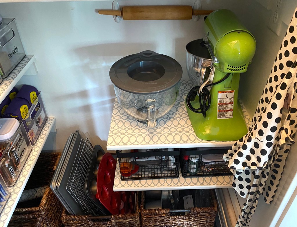 Despite the fact that we bake two to three times per month, I’m always prepared to make chocolate chip oatmeal cookies, chocolate zucchini muffins, gingerbread cookies, banana bread, and pie crust. You know, the staples. Because I love to create zones, the pantry houses “the baking zone” which is almost anything that involves baking – the stand mixer, parts and pieces, cookie sheets, cooling racks, cookie cutters, pie making accoutrements, aprons, and sprinkles.