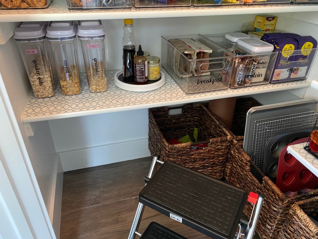 We have 8′ ceilings, so the top shelf isn’t that high. It does require a small two step ladder to reach, so that is where we store items that we need less frequently. That includes the vacuum sealer (on a large bamboo stacking shelf) and supplies (in a large plastic storage bin with handles) and back stock of seasonings and spices (in a clear handled storage bin – no longer sold – similar). Other back stock items are on an 18″ lazy-susan, which are also called turntables. Then the rest of the back stock are stored in plastic kitchen organizers from Target.