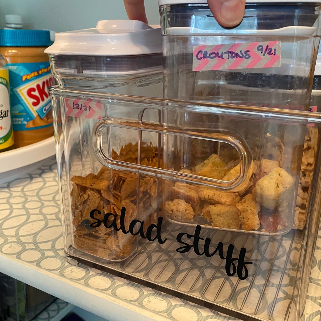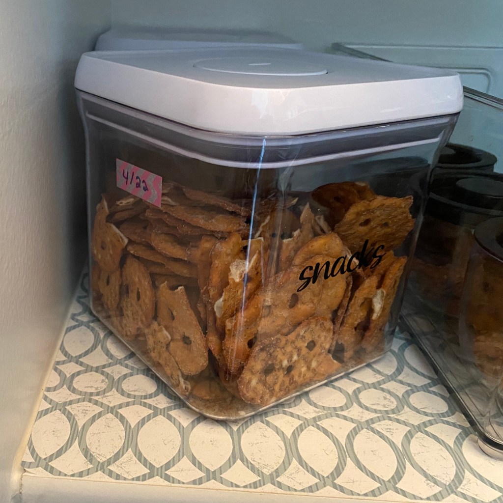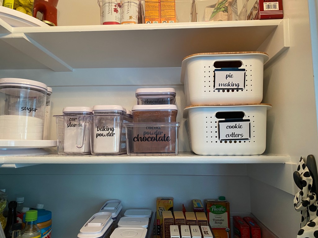 Dry goods are stored on the next shelf down, and we can reach those without a step ladder. The bins are various OXO containers with custom vinyl labels. I use a piece of washi tape and a sharpie to mark the expiration date on each container. If something gets used up or expired, I hand wash the container and let it dry before refilling the container and adding a new expiration date. The only container I don’t apply an expiration date to is the white granulated sugar, and that’s because I have never gone more than two months without replacing it (it’s not us, it’s the hummingbirds, I swear). I also store cookie cutters and pie making bins because there was space, and I make cookies and pies so infrequently.