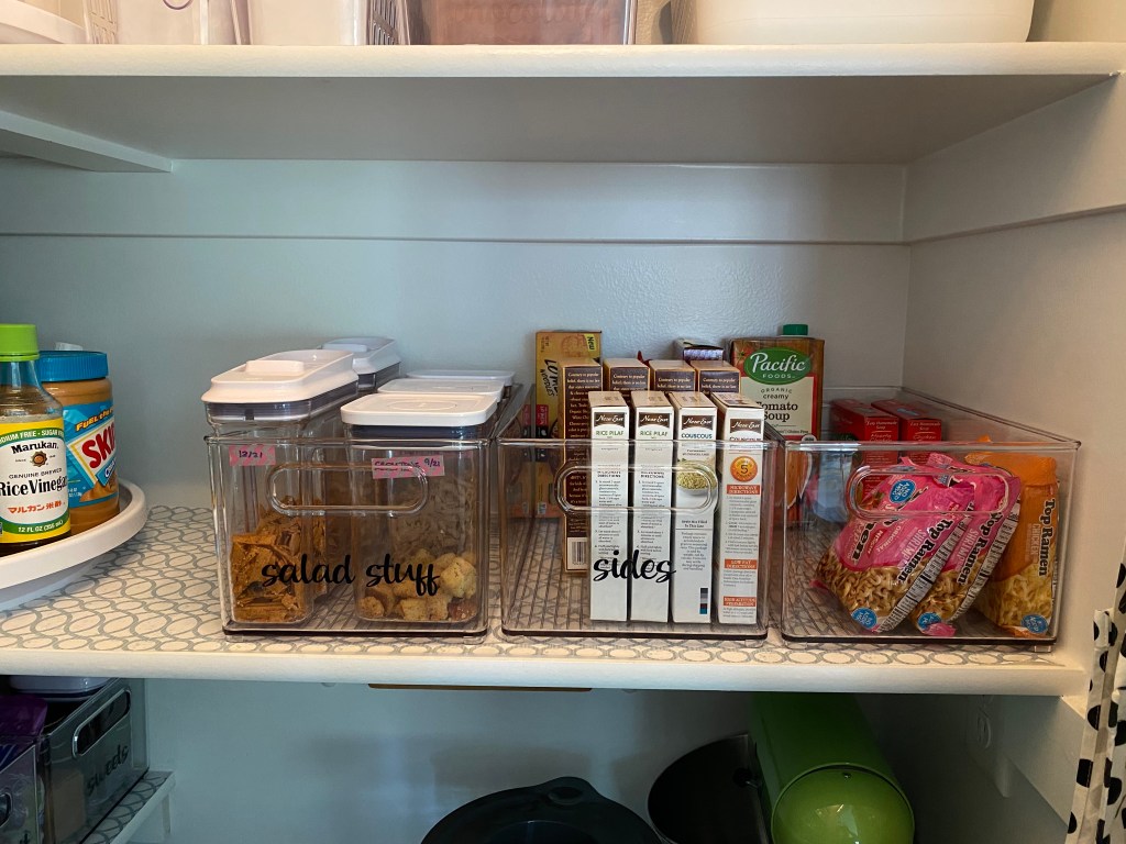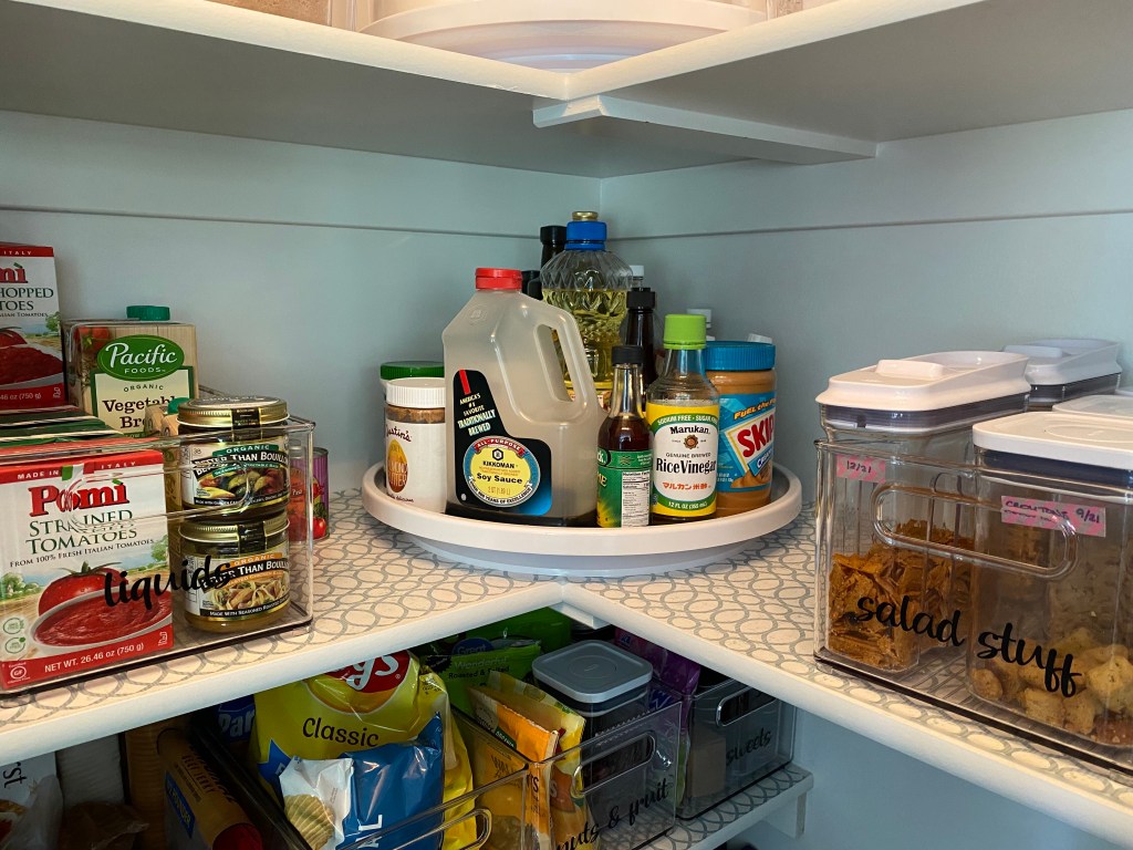 Prime Real Estate, in organizing terms, is space that is eye level and easily accessible. This is where I store things we use frequently. Canned goods (on a can organizer) sauces, sides, and spreads. We make a lot of salads and rice bowls, so they have their own bins.