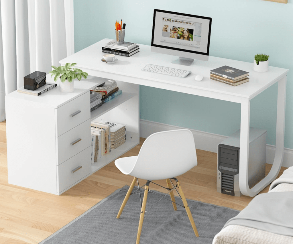 The desk was left behind by the previous owners, so Kenzee had no emotional tie to it. It was too large for the space and had a shelf on the size but no other storage. While her work required no paperwork or items to store, she does also use the room for her schoolwork and crafting so wanted storage for her personal items. This desk worked perfectly.