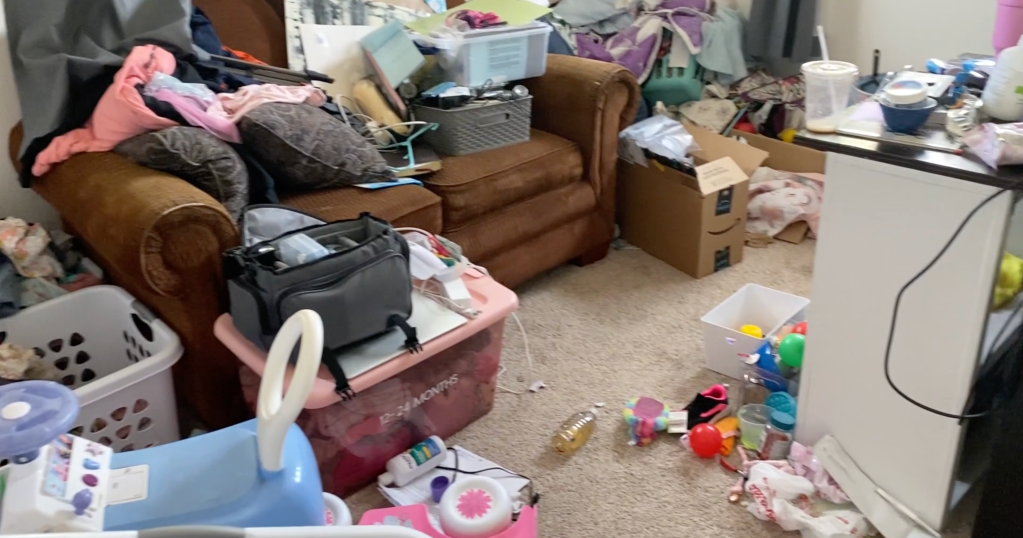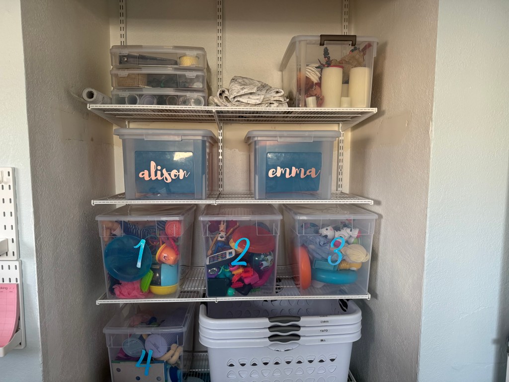 The room was filled with toys and laundry that needed to be sorted (mostly clothing that was too little for kiddo #1 and too big for kiddo #2). Kenzee was cycling toys for her kiddos, so 75% of the toys lived in this room, while the remaining toys lived in the living room, where the kids spent most of their time playing. Unfortunately there wasn’t much organization to the toys other than one went away and another would go out.