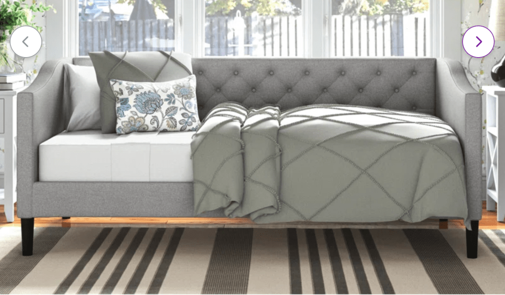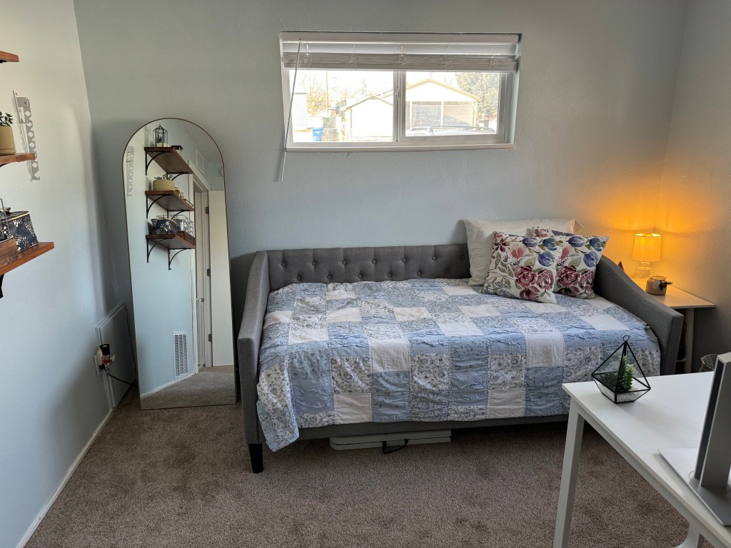 To start, Kenzee needed furniture. The desk she was using was left behind by the previous owners but was unfortunately much too large for the space. The loveseat was used as a guest bed if a family member or friend needed to spend the night, and no, it was not a fold out couch. For the room to function as a Home Office & Guest Room, it needed an appropriately sized desk and an actual bed. Fortunately, through some internet help I was able to source a desk, daybed, and a mattress.