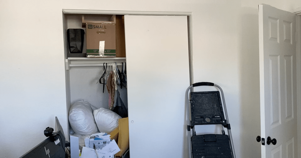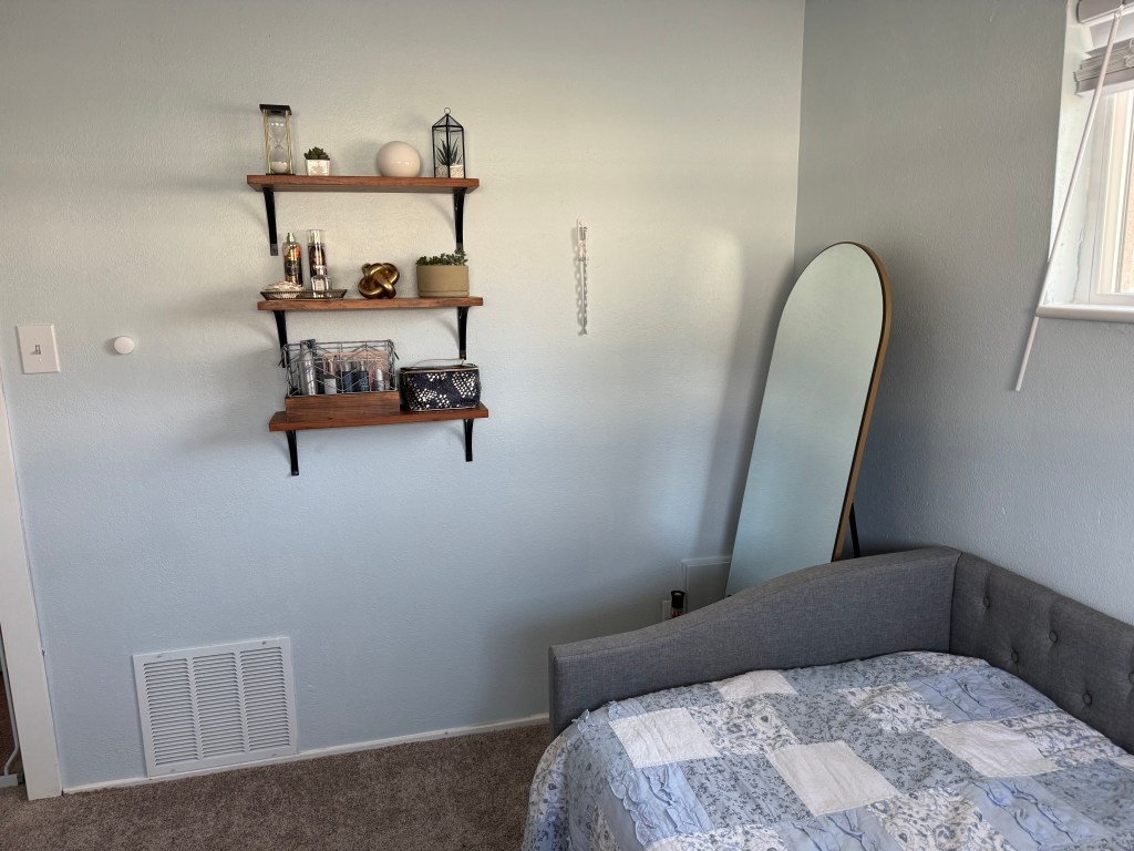 Kenzee still wanted to use the room to fold laundry, as her laundry room doesn’t have space for that. We were able to make space for the laundry bins in the closet, and also space to fold, as I had an extraneous adjustable height folding table that could easily slide under the guest bed when not in use. A few more pieces we were able to find from a BNSN group, and the room really came together!
