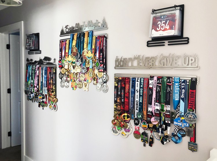 As you can see, we have almost run out of space again. This is after I sorted through all of our medals and pulled out a couple of several years old virtual races that were Christmas themed to make into ornaments for the tree this coming year (an idea I got from Young House Love). And we still have more medals to add this year!